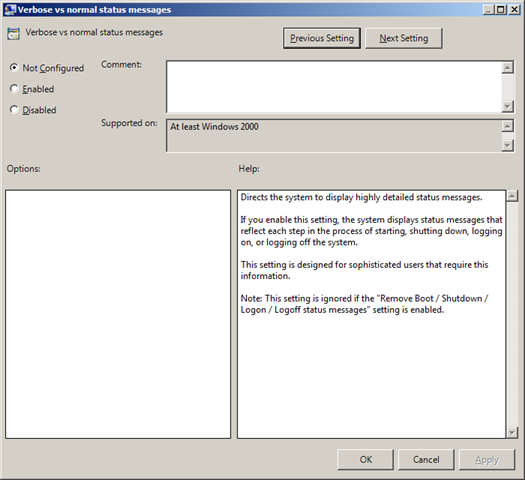 This weeks Group Policy Setting of the Week (GPSW) can be found under Computer > Policies > Administrative Templates > System and is called "Verbose vs normal status message". It is a really simple setting that doesn't actually do much but I dub this setting the "Make my computer start faster" setting which give users the illusion that their computer are working faster.