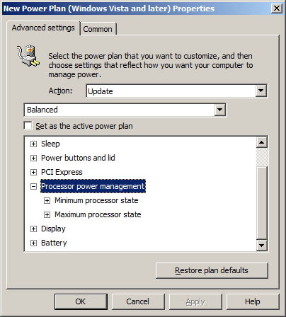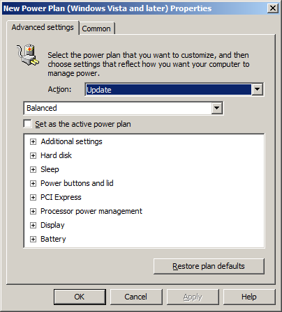 I have selected for this weeks Group Policy Setting of the Week (GPSW) the group policy preferences that is used to configure Power Plans. While configuring power plans for your environment may be nothing new if you have deployed third party tools, you can now avoid the added expense and complexity of doing this as this functionality is now provided out of the box. This option can be found under User Configuration > Preferences > Control Panel Settings > Power Options and is used to control the individual power plan for your computers. Strangely I have found that this option only works under the User Configuration setting which I presume is the case because it is normally a user configured setting even though the option is under the computer configuration section as well. This power plan option also work with Windows XP however you do need to explicitly select the correct OS power plan as the XP plan will not work on Vista+ and vice versa. Windows Vista and later Power Plan