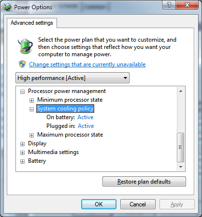 As you can see this can be used to configured almost all the power plan setting that your version of windows has to offer. One notable omission is the CPU System Cooling Policy setting that was introduced with Windows 7 which is not available to be configured in the Vista (or later) power plan. Left (Windows 7 System cooling policy) Right (Windows Vista and Later plan without the System cool policy option)