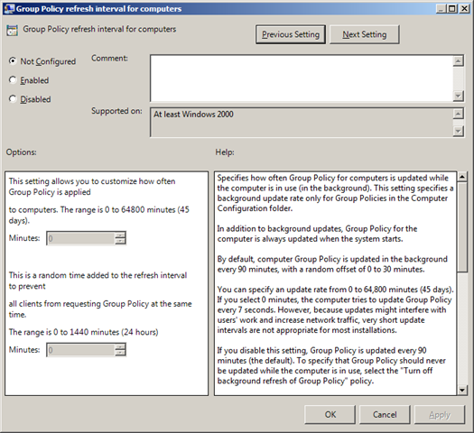 This weeks (and first for the year) Group Policy Setting of the Week is a Group Policy setting that configures Group Policy. The "Group Policy refresh interval for computers" can be found under Computer Configuration > Policies > Administrative Templates > System > Group Policy and is used to control how often the background computer refresh interval of a performed.