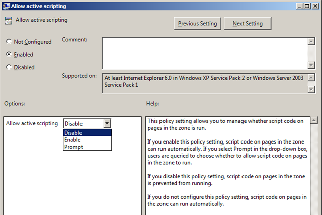 So to make this change in Group Policy open the Group Policy Object (GPO) that is targeted on your user accounts and navigate to User Configuration > Policies > Administrative Templates > Windows Components > Internet Explorer > Internet Control Panel > Security Page and then under the "Local Intranet" and "Internet" configured the "Allow Active Scripting" option to "Disable" or "Prompt" (see image below).