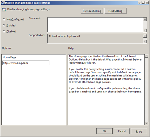 This option allows the admin to configured a single home page for the user without the ability for the user to add any other secondary home pages if they are using IE7 or IE8. This setting will also work however if the users has IE5 and above installed. Step 1. Edit a GPO that targets the users that you want to apply the home page setting. Step 2. Navigate to User Configuration > Policies > Administrative Templates >Windows Components > Internet Explorer Step 3. If you want to configure a single home for your users and/or you are using IE5 or IE6 edit the "Disable changing home page setting" Step 4. Select "Enabled" and then type the URL you want as the home page in the "Home Page" text field.