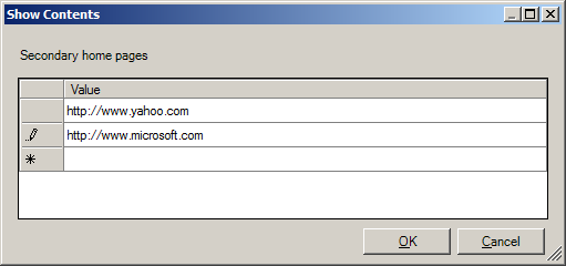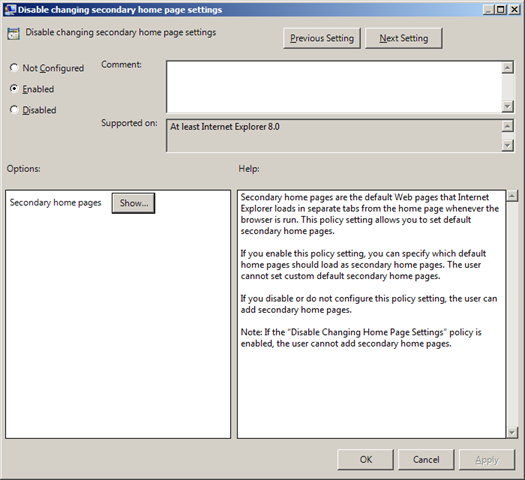 This option allows the admin to specify the users secondary home pages while still allowing them to configured the default home page. Note 1: This policy setting will not work with IE7 that does support secondary home pages. Note 2: This policy setting will not work if you have the "Disable changing home page settings" also enabled. Step 1. Edit a GPO that targets the users that you want to apply the home page setting. Step 2. Navigate to User Configuration > Policies > Administrative Templates >Windows Components > Internet Explorer Step 3. If you want to configure a single home for your users and/or you are using IE5 or IE6 edit the "Disable changing secondary home page setting" Step 4. Select "Enabled" and Click on "Show..."