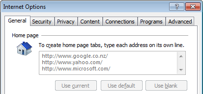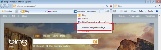 The user will now have http://www.yahoo.com and http://www.microsoft.com load as their secondary home pages and they will be able to change their default primary home page by using the"Add or Change Home Page..." option (see image below).