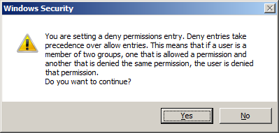 Then click OK. Note: Remember that deny permission take precedence so inherited permission will not have any affect and that we are applying the permission directly to a file so we don't need to worry about inheritance from this object.