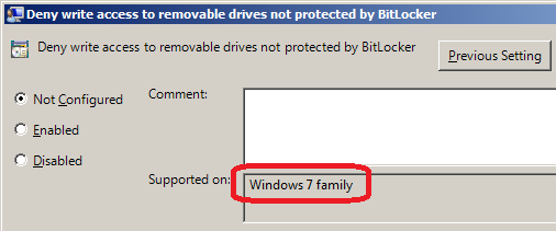 One of the great new features with Windows 7 was Bitlocker to Go that enabled IT Administrators to ensure that all data written to USB drives is encrypted. In conjunction with this new feature Microsoft also added another option called "Deny write access to removable drives not protected by BitLocker" which allowed user to still read the files off USB drives that were not encrypted. The problem with this policy setting is that it is only supported on Windows 7 family computers so unless you are running a SOE that is 100% Windows 7 users could simply logon to XP or Windows Vista to get around this restriction.