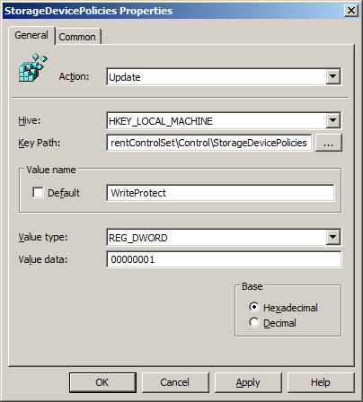 Luckily Microsoft added a new feature to Windows XP Service Pack 2 that allowed administrator to prevent writing to USB block storage devices (a.k.a memory sticks ) which can be implemented via a Group Policy Preferences registry key. Key: HKLM\System\CurrentControlSet\Control\StorageDevicePolicies Value: WriteProtect (REG_DWORD) Data: 0 = Disabled Data: 1 = Enabled To implement this edit a Group Policy Object that is applied to all the workstations in your organisation navigate to Computer Configuration > Preferences >Windows Settings > Registry. Then click on Action > New > Registry Item type System\CurrentControlSet\Control\StorageDevicePolicies into the Key Path field then type WriteProtect into the Value Name field and 1 in the Value Data field and click OK.
