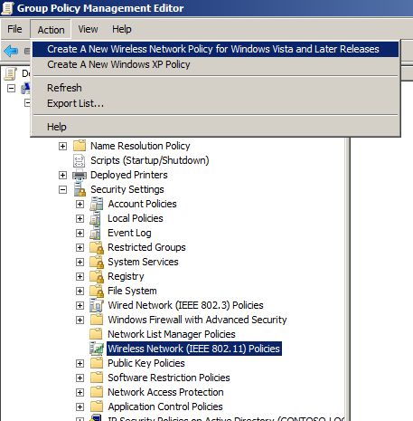 Step 3. Click on "Action" in the menu and then click on "Create A New Wireless Network Policy for Windows Vista and Later Releases".