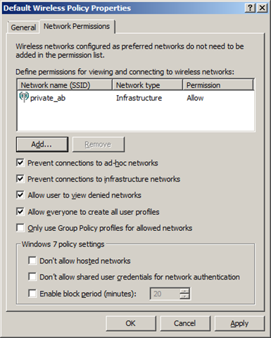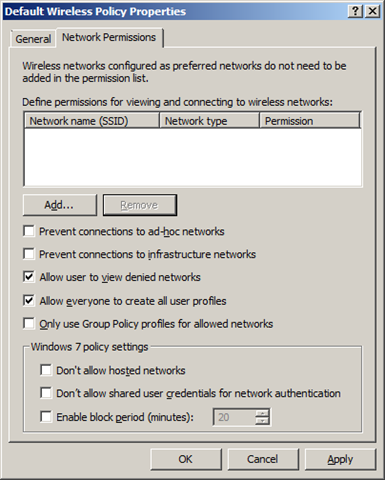 Now if you want to totally deny you users from connecting to any network profile just skip step 6. from the White List procedure leave the "Prevent connections to ad-hoc networks" and "Prevent connections to infrastructure networks".
