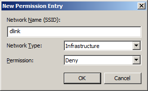 Step 6. Type in the name of the SSID you want to black list (e.g. "dlink") then select the type of Network Type (e.g. Infrastructure) and select "Deny" from the Permission type then click "OK"