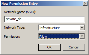 Step 6. Type in the name of the SSID you want to white list (e.g. "private_ab") then select the type of Network Type (e.g. Infrastructure) and select "Allow" from the Permission type then click "OK"