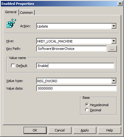 Microsoft have released article KB2019411 explaining how IT administrators can disable a Browser Choice screen for their users using a simple registry key. Key: HKLM\Software\BrowserChoice Value: Enable Data: 1 (REG_DWORD) = Enabled Data: 0 = Disabled Now of course you can deploy registry key using Group Policy Preferences which will make it much easier for IT administrators disable this screen. Step 1. Edit a Group Policy Object that is applied to all the workstation you want this Browser Ballot disabled. Step 2. Navigate to Computer Configuration > Preferences > Windows Settings > Registry and create a "New Registry Item" Step 3. Type "Software\BrowserChoice" in the Key Path then type "Enable" in the Value name, then select REG_DWORD as the value type "0" in the value data and then click "OK".