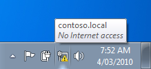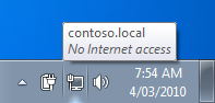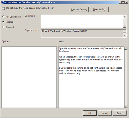 However if you find this error message really annoying there is now a Windows 7 group policy will turn it off. This is a machine setting so edit a Group Policy Object that is applied to all the workstations you want to turn this message off. Then navigate to Computer Configuration > Policies > Administrative Templates > Network Connections and enabled the "Do not show the "local access only" network icon" policy setting.