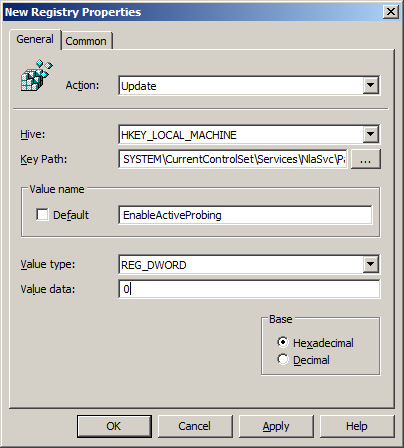 Unfortunately Windows Vista does not have the same Group Policy however there is a registry key that can be applied using Group Policy Preferences that has the same affect. Key: HKLM\SYSTEM\CurrentControlSet\Services\NlaSvc\Parameters\Internet Value: EnableActiveProbing Data: 1 (REG_DWORD) = Enabled Data: 0 = Disabled Step 1. Edit a Group Policy Object that is applied to all the workstation you want this Browser Ballot disabled. Step 2. Navigate to Computer Configuration > Preferences > Windows Settings > Registry and create a "New Registry Item" Step 3. Type "SYSTEM\CurrentControlSet\Services\NlaSvc\Parameters\Internet" in the Key Path then type "EnableActiveProbing" in the Value name, then select REG_DWORD as the value type "0" in the value data and then click "OK".