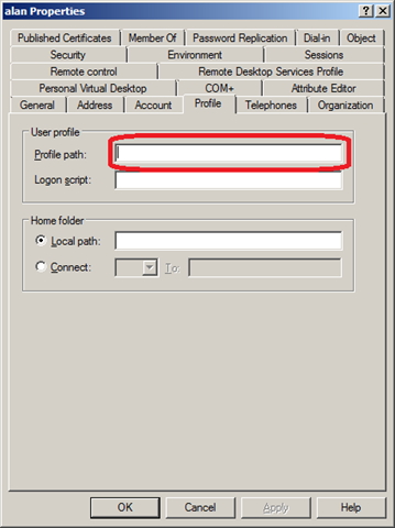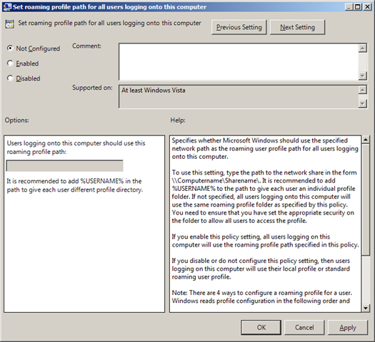 Back to another profile setting this week and this one can save any organisation using Windows Vista or greater a lot of time if you manual provision your accounts. The setting is called "Set roaming profile path for all users logging onto this computer" and it configures the users roaming profile path that is normally configured on a per account basis in Active Directory Users and Computers (see below). Being able to apply this setting via Group Policy means it is one more user attribute that you no longer need to configure on the users account. This of course makes provisioning users account just that little bit simple which should save both time and the possibility for human errors.