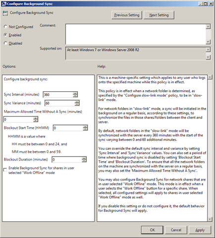 This weeks setting of the week is second is another one of the new Windows 7 offline file settings called "Configure Background Sync" which can be found under Computer Configuration > Policies > Administrative Templates > Networks > Offline Files. This setting allows you to configured the new Windows 7 feature that background sync's offline file when a computer is in "Slow Link" mode.