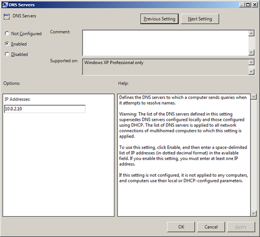 I used to think that it was not possible to set IP address information via Group Policy however I did some checking this week and was pleased to find that there was a way to configure your computers DNS Server addresses. Unfortunately this setting only applies to Windows XP, however lots of people still use XP so it is still somewhat relevant. This setting is simple called "DNS Servers" and can be found under Computer Configuration > Administrative Template > Network > DNS Client.
