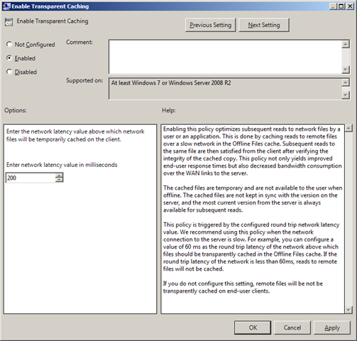 This setting is used to "Enabled Transparent Caching" and can be found under Computer Configuration > Policies > Administrative Templates > Networks > Offline Files. Unfortunately I have not had a chance to try this option for my self but reading the description it seems to be nothing short of hidden killer feature for Windows 7. The transparent cache feature kicks in on any offline files whenever latency to the file server goes above a certain limit. Now everyone's environment is going to be different based on file server performance and network latency so be sure you do some testing first to get the right balance. When this setting is combined with last weeks "Configure Background Sync" option then you could drastically reduce latency to the file server and decrease bandwidth consumption. This options sound ideal for Direct Access and VPN users as their latency to the file server could vary drastically depending on the networking conditions or it could be configured to mask any performance issues that are noticed when a file server is being backed up.