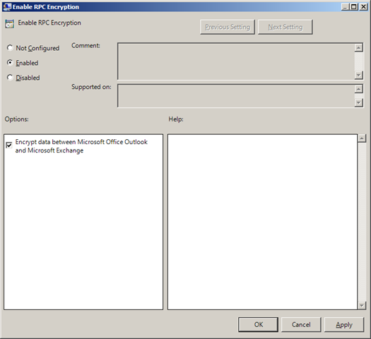 This weeks setting is a little bit different as this is the first time that I have selected a non-managed policy setting, but I have chosen this one as it is probably a setting that will be used in a lot of organisations as they start to rollout Exchange 2010. This setting is called "Enable RPC Encryption" and it is a Outlook 2003 specific setting that enables encrypted RPC communication with the exchange server. The reason why this setting is now so important is that starting with Exchange 2010 all RPC communication with the server requires encryption by default. This setting can be found under User Configuration > Policies > Administrative Templates > Classic Administrative Templates > Outlook 2003 RPC Encryption > Exchange Settings however remember as this is a non-managed policy you may need to enable option to see non-managed settings.