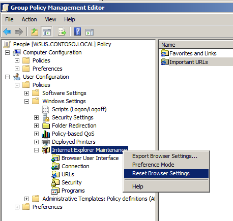 If you have ever configured you Internet Explorer setting via the "Internet Explorer Maintenance" group policy setting you might be wondering however to remove these setting now you found a few easier ways to do the same thing. Well its not all that obvious but if you go to User Configuration > Policies > Windows Settings you can then right click on "Internet Explorer Maintenance" and click "Reset Browser Settings" you are done...
