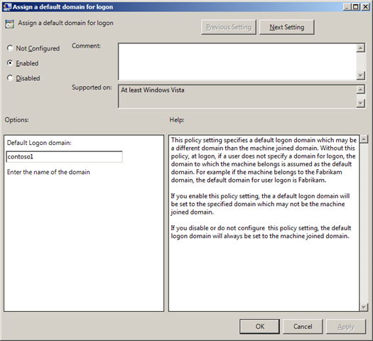 This weeks setting is a native policy for Windows Vista (or greater) called "Assign a default domain for logon". As the name suggest it configured the default domain name when a user logs on to the computer. This is very handy in a multi domain environment or if you want to make sure that your newly built computer default to the correct domain when the users logon for the first time. This setting can be found under Computer Configuration > Administrative Templates > System > Logon and it requires requires at least Windows Vista.