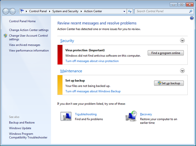 In this article I have will show you how to turn off the Backup Notification message in eh Windows 7 Action Center. I have previously blogged about how to do this using Group Policy Preferences here (How to use Group Policy to turn off the Backup Notification in the Windows 7 Actions Center) however since writing this post Microsoft has come out with a new MSDN article explaining how to do this using a much simpler registry keys.