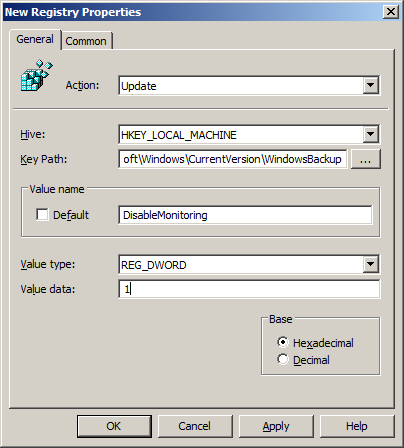 Key: HKEY_LOCAL_MACHINE\SOFTWARE\Microsoft\Windows\CurrentVersion\WindowsBackup Value: DisableMonitoring Type: REG_DWORD Data Enabled: 0 (or not exist) = Disabled Data Disabled: 1 = Enabled