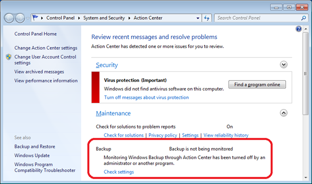 Now you will see that the Backup section of the Action Center has been disabled.