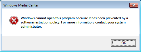 When the setting is enabled the user will still see the shortcut to Windows Media Center however when the user tries to run the program they will be presented with the following dialogue box.