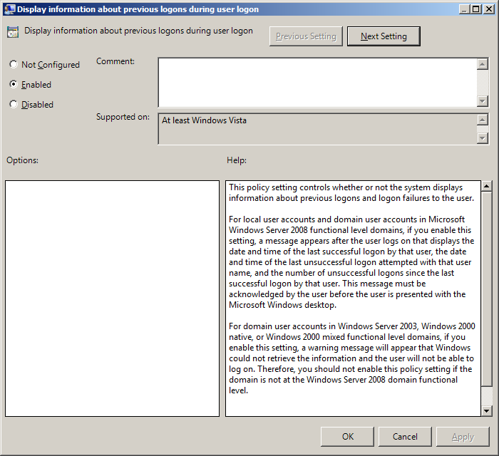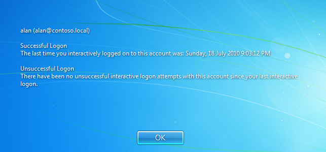 This weeks setting is one that has just been mentioned in the AD Blogs Friday mail sack and until today was a setting/feature of Windows Vista/7 that I didn't know existed. This setting display information about previous logons during a user logon and is very similar to the last logon screen I see when logging onto an online banking web site. This setting can be found under Computer Configuration > Policies > Administrative Templates > Windows Components > Windows Logon Options and must be applied to workstations AND domain controllers for it to work. The only down side for this setting is that you need to be in 2008 native mode to work so this might exclude some organisations for now.