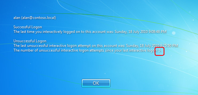 In this example we see the message when someone logon successfully where the 5 previous logon events had failed. Obviously this logon count number (see highlighted below) would raise a really big red flag for a users especially if you are sure that you were not the one to logon incorrectly.