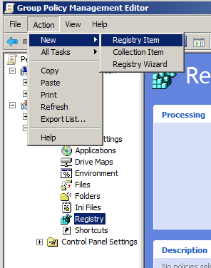 Step 2. Navigate to User Configuration > Preferences > Windows Settings > Registry then from the menu click on Action > New > Registry Item