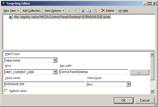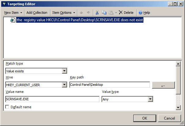 Now we will target the screen saver to apply only when the "HKCU\Control Panel\Desktop\SCRNSAVE.EXE" registry key does NOT exist as this means the screen saver has been configured to "(None)".