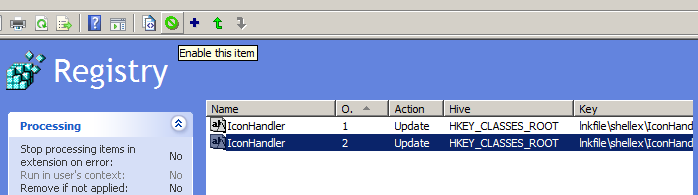 Step 9. Click on the second IconHandler registry item and click "Enable this item" (Green Circle) in the toolbar.