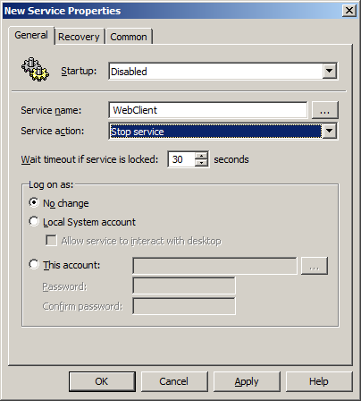 Step 14. Change the Startup value to "Disabled" and type "WebClient" in the Service Name text field then change the Service Action to "Stop Service" and click OK.