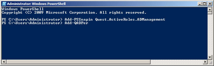 Step 3. To test that the new PSSnapin is loaded type "add-qadper" and then press the "Tab" key to complete the command.