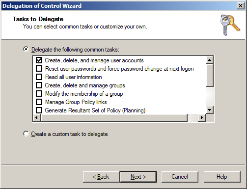 To delegate the same permission as the "Create, delete, and mange user accounts" (effectively Full Control) option in the "Delegation of Control Wizard" (see below) you need to delegate two permissions to the OU. ![]()