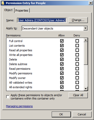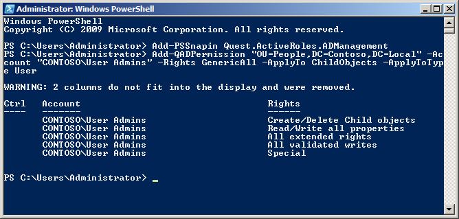 Add-QADPermission "OU=People,DC=Contoso,DC=Local" -Account "CONTOSO\User Admins" -Rights GenericAll -ApplyTo ChildObjects -ApplyToType User