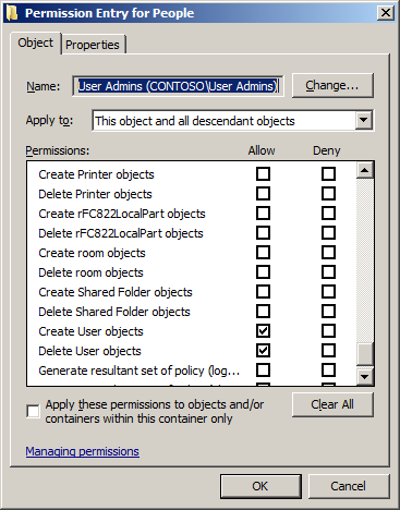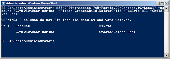 Add-QADPermission "OU=People,DC=Contoso,DC=Local" -Account "CONTOSO\User Admins" -Rights CreateChild,DeleteChild -ApplyTo All -ChildType User