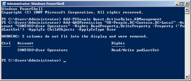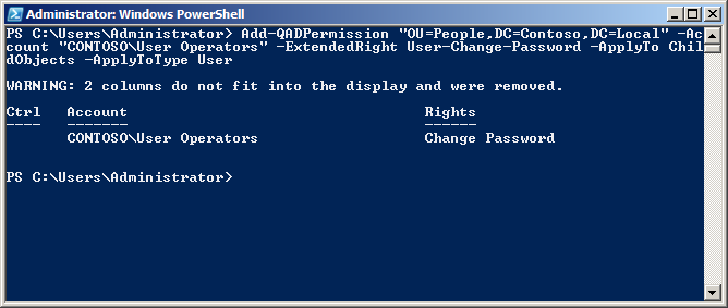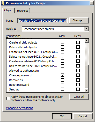 Add-QADPermission "OU=People,DC=Contoso,DC=Local" -Account "CONTOSO\User Operators" -ExtendedRight User-Change-Password -ApplyTo ChildObjects -ApplyToType User