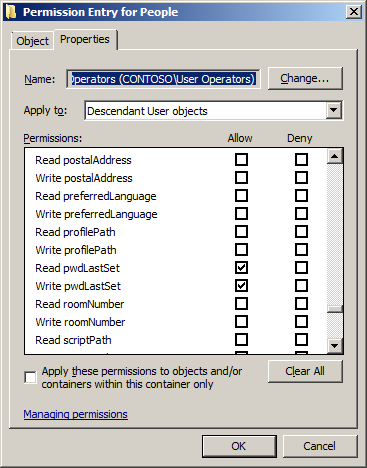 In this example we are going to delegate Allow Read and Write permission to the Pwd-Last-Set Attribute to all User objects to the OU with the distinguished name of "OU=People,DC=Contoso,DC=Local" to the group called "User Operators".