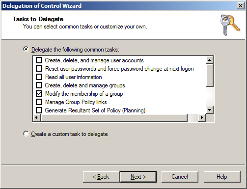 To delegate the same permission as the "Modify the membership of a group" option in the "Delegation of Control Wizard" (see below) you only need to apply one command to delegate the appropriate permissions. ![]()