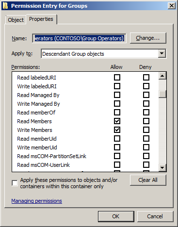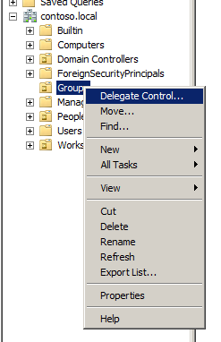 In this example we are going to delegate Change group membership permissions on all the Group objects to the OU with the distinguished name of "OU=Groups,DC=Contoso,DC=Local" to the group called "Group Operators"