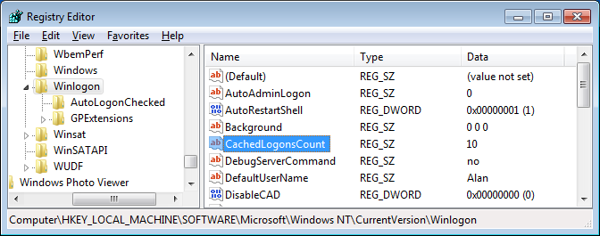 This of course makes it almost impossible to configure the computer into a workgroup so that it can then be re-added to the domain to fix the problem. Its even more difficult if you have BitLocker encryption enabled on your local hard drive. It is possible that you could logon with a user with local administrator access using cached credentials however this is limited to the last 10 people that logged on (increasable to 50 if you change the CachedLogonsCount below registry key).