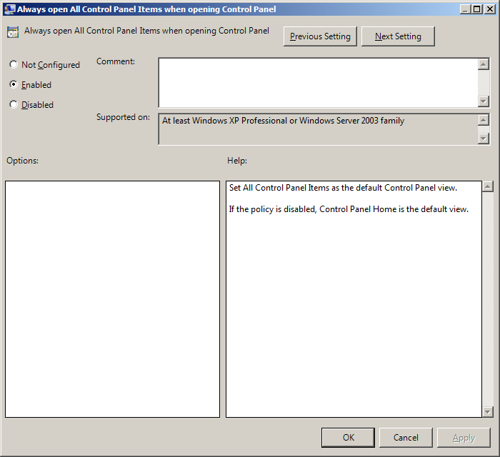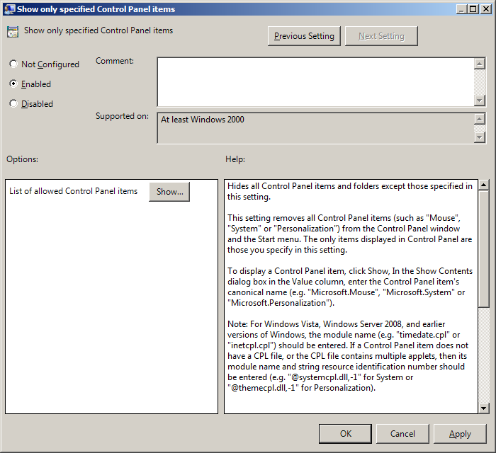 Note: This option is probably not needed if you used the Show only specified Control Panel setting instead.
