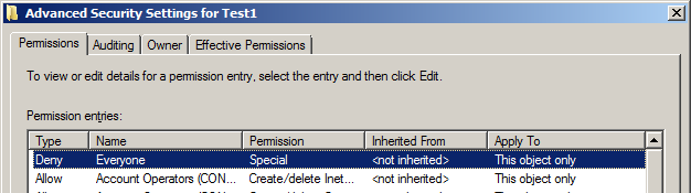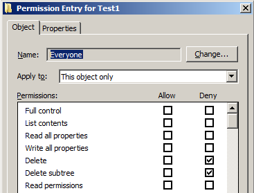 The affect of ticking this check box was that the "Everyone" group would be granted deny delete permission (see below) on the object so that it would be very hard for you to accidently delete an OU (and all of its contents) even if you are a Domain Admin. NICE!!!
