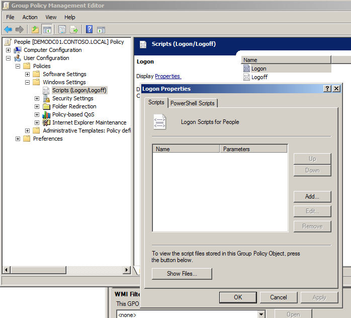 Step 2. In the same Group Policy Object navigate to User Configuration > Policies > Windows Settings > Scripts (Logon/Logoff) and double click on the Logon (or logoff) option. Then click on the "Show Files" button.