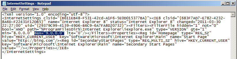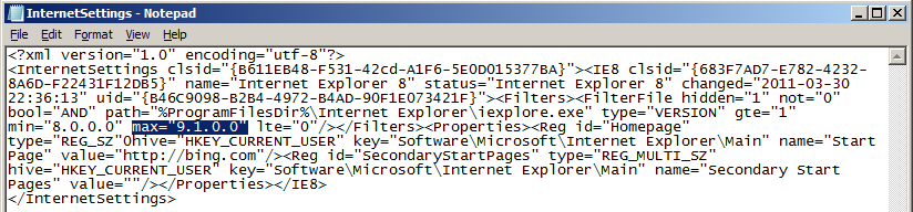 Now we are looking at the XML that is used to apply the Group Policy Preferences settings. This is where we need to change the version number to support IE9. Tip: Enable "Word Wrap" in notepad to see the text on multiple lines. Step 5. Change "max=9.0.0.0" to "9.1.0.0" (see below) Before:
