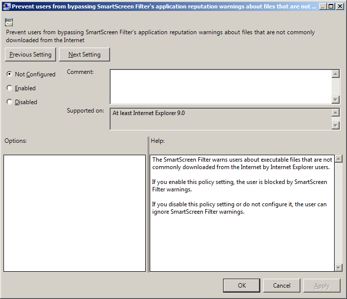 - Prevent users from bypassing SmartScreen Filter's applications reputation warnings about files that are not commonly downloaded from the Internet