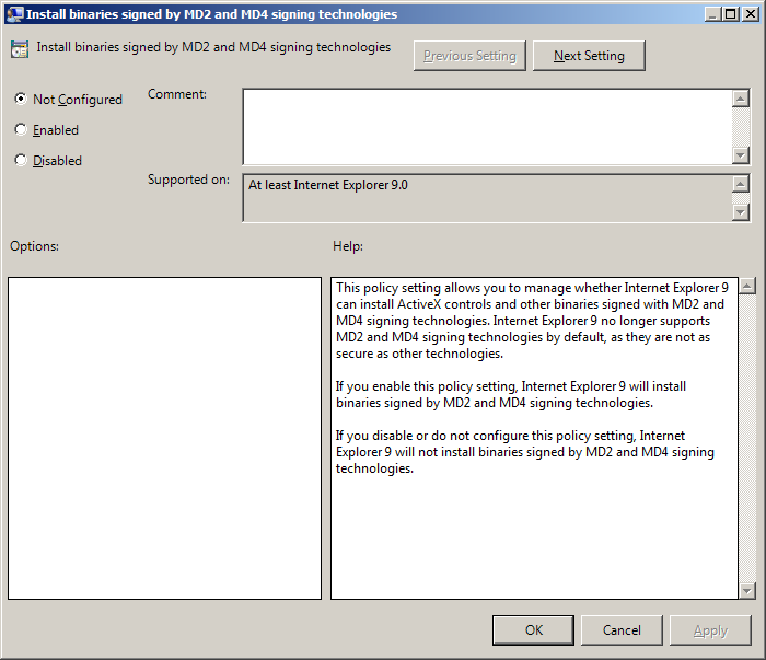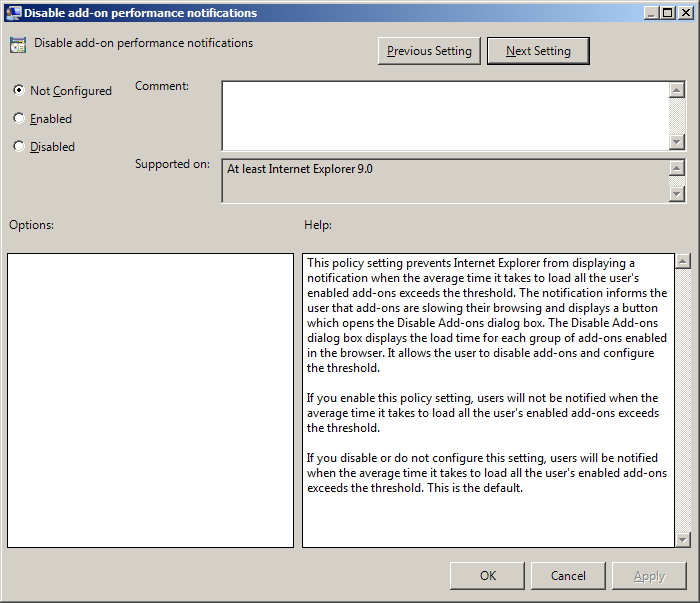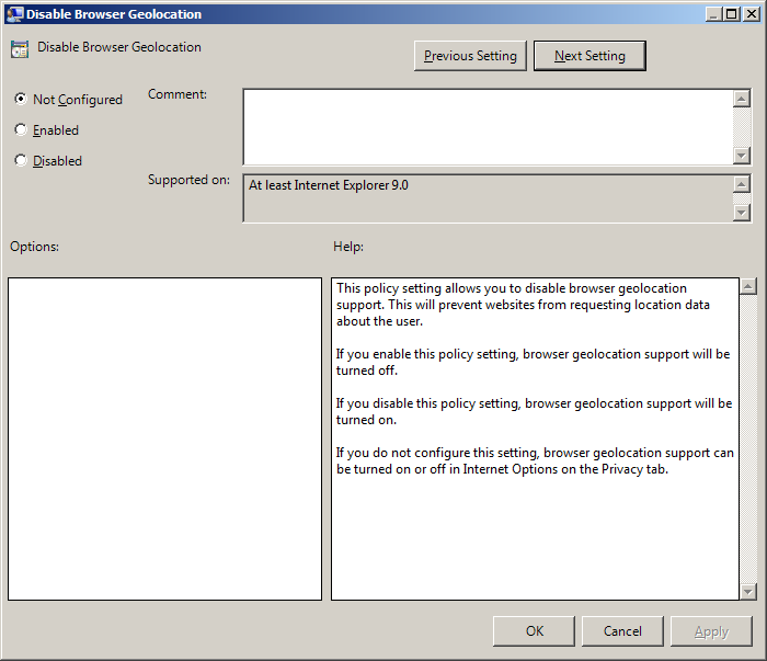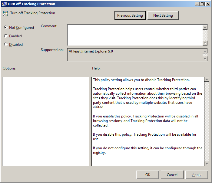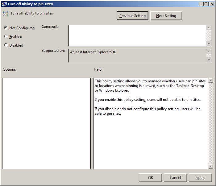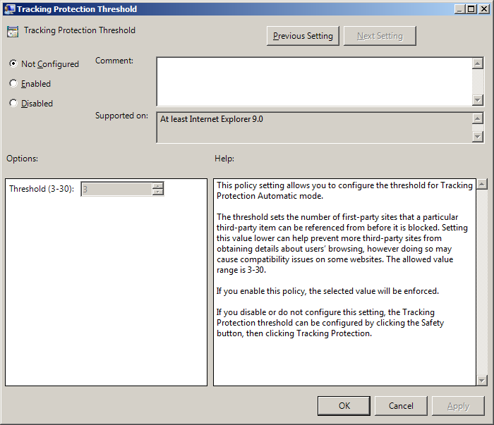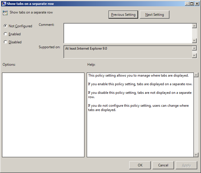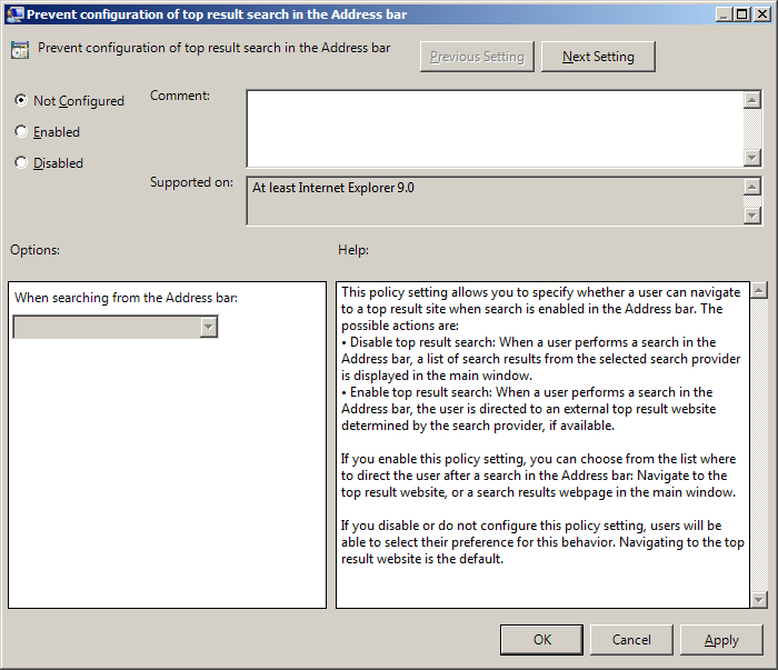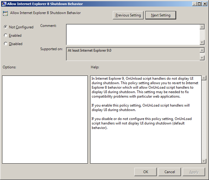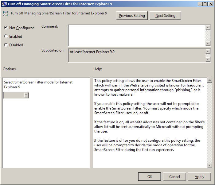 Microsoft today released the final version of Internet Explorer 9 to the web at http://windows.microsoft.com/ie/ . Since the release of the IE9 Release Candidate there have been a few more Group Policy added (see Internet Explorer 9 (RC) Group Policy Settings) so below is an updated list of each IE9 Group Policy settings with a related screenshots.